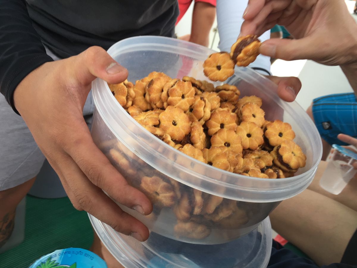 スピードボートに乗船直前に履物はすべて回収され、帰着まで裸足です!島をゴミなどから守る為と考えれば仕方ないですね。荷物は足元のちょっとした所に収納しますが、かなり濡れるので、ゴミ袋か何かを持って行った方が良いと思います。船内では、水、ソフトドリンクが準備されており、『僕のmamaが作ったんだ!笑』と言ってガイドさんが配ってくれたクッキーがおいしすぎて♡