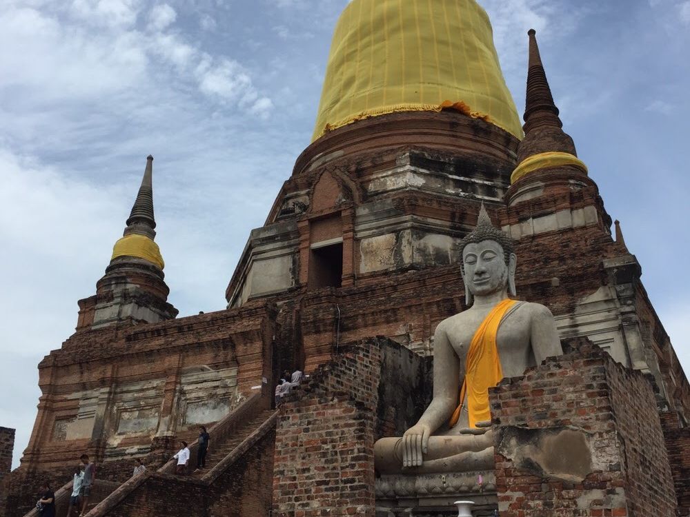ワットヤイチャイモンコンでは少し自由行動もあり、遺跡に登ったりできます。寝釈迦も青い空に黄色と白が映えてとても素晴らしかったです。