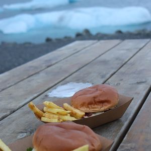 1日目昼は間欠泉の目の前のレストラン(スープ3900円)とパン、2日目はヨークルス氷河の屋台的なんでハンバーガー(3000円)ホットドックも隣の店で売ってました。3日目はブラックサンドビーチ目の前のカフェ