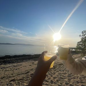 17時にサンセットドリンクで酒又はジュース1杯を飲むことができ、夕日を見ながら飲むシャンパンは最高でした。夕陽が沈むまでに島を1周しましたが、砂浜を歩いて歩きにくかったため、30分くらいかかりました😂