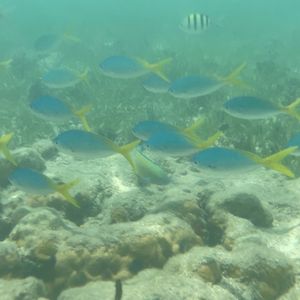 今回はゲストハウスに1泊しました。1日目は、9:20にグリーン島に到着して、昼頃に着替えて、シュノーケリングセットを借りて12時から15時頃までビーチや桟橋付近で泳いだり、売店でご飯食べたりしました。昼頃は引き潮で海が浅いので、サンゴ礁が近くで見れて浜辺から近くで泳いでも魚が見やすかったです。