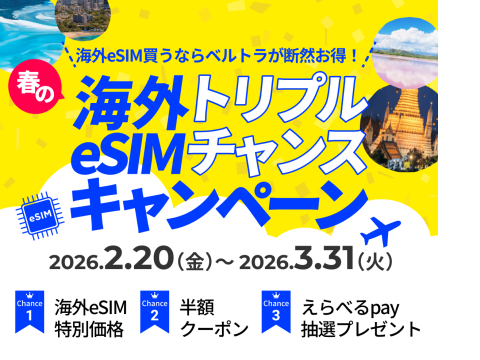 春の海外eSIMトリプルチャンスキャンペーン | 観光・オプショナルツアー専門 VELTRA(ベルトラ)