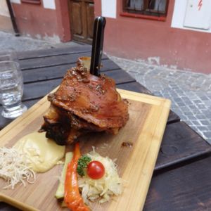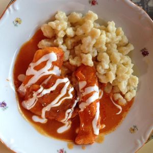ハンガリー料理店ヴァローシュリゲットでランチ(セットメニューは、伝統的料理のグラーシュスープとチキン パプリケーヌ、デザートのチョコレート ダンプリング)店主は陽気で片言の日本語で話しかけてくれフレンドリー!サプライズにギターの生演奏!