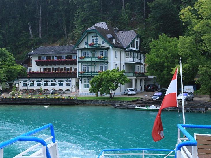 ヨーロッパの大洪水の後のため、湖水が濁っていて、残念でしたが、いいお天気であついぐらいでした.湖を自由にモーターで回れるボートに30分乗って、岸辺近くを観光できました。