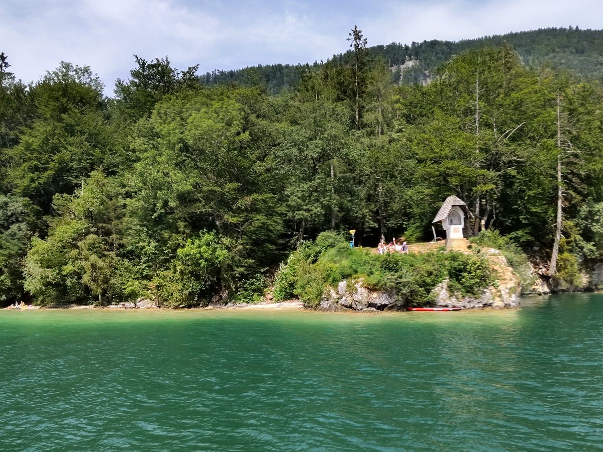ヴォルフガング湖ではクルーズ船に乗船しました。ガイドさんが客室外側の前方左側の一番良い席を案内してくださいました。そこでゆっくりビールを飲みながら湖畔の景色を楽しみました。