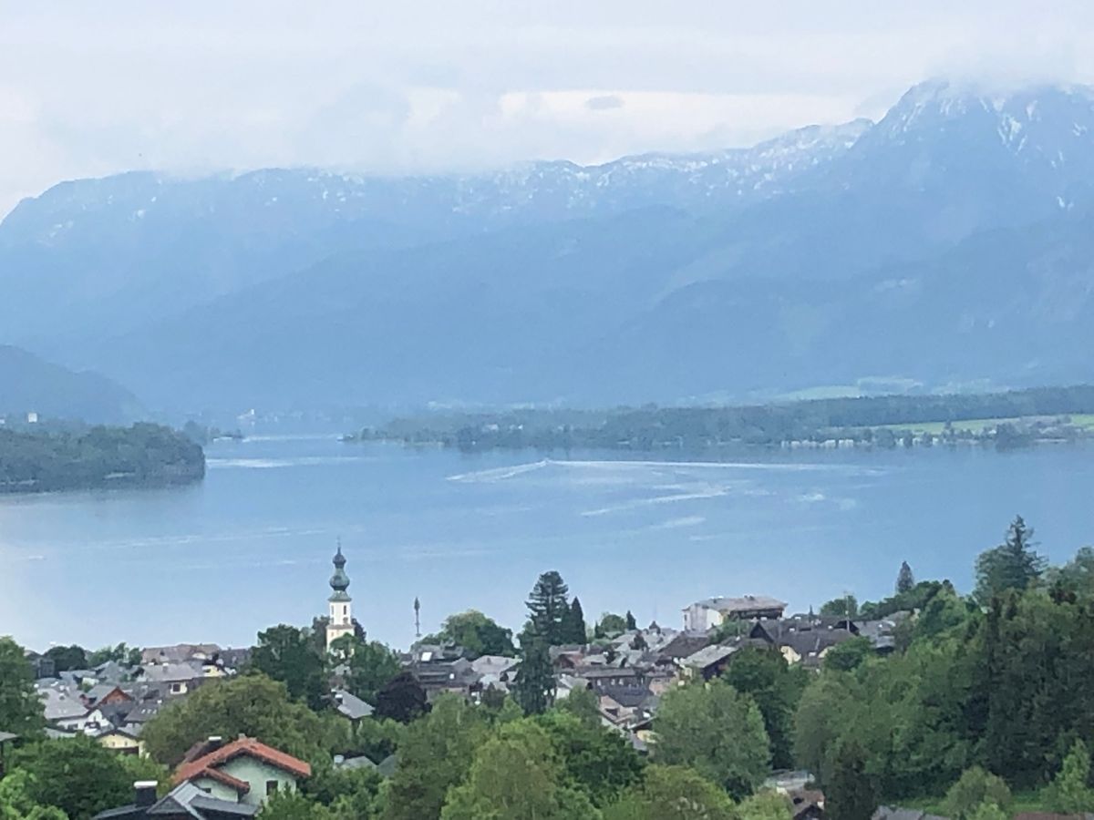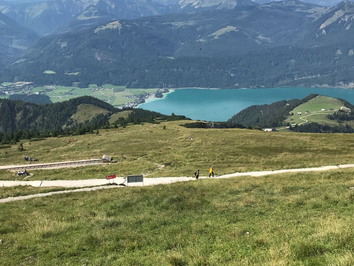 途中車窓からの観光をしながらシャーフベルクの麓の駅に到着。かわいい蒸気機関車が客車を一生懸命押して上がってくれました。最高のお天気に恵まれ、遠くアルプスの山々まで見えて感動!来た甲斐がありました。