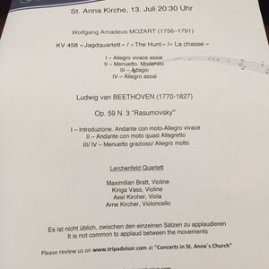 約1時間のコンサートでした。聖アンナ教会内はとても美しく、その中で聞く演奏は最高でした。値段も手ごろでした。他の大きな会場ですとドレスコードがありますが、こちらはドレスコードが特にありませんでした。個人旅行でスーツやネクタイなどを持って行けない方は、カジュアルな格好で参加できるこのようなコンサートはおすすめです。