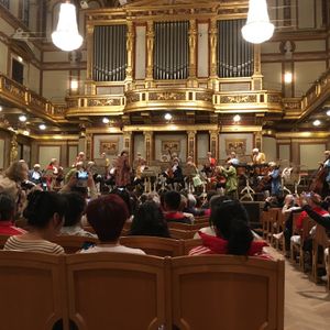 楽友会館黄金の間でのコンサートでした。C席でしたが、早めにチェックインしたためか2階桟敷席最前列で、舞台は良く見えました。指揮者、演奏者ともモーツァルト時代のコスプレをしていて、観光客向けの曲を気楽に演奏している感じがありました。客席も噂ほどひどくはないもののずっと静粛という訳ではないので、真面目に音楽を鑑賞したい方なら失望するかも知れません。ネクタイをしている方はかなり少数派でした。ただ、建物や黄金の間自体は素晴らしく、見かけだけでなくホールとしての音響も良いので、楽友会館見学目的と思えば悪くないと思います。また、オペラ歌手の方は美声でしたし、各席が静かで演奏がうまく行っているときは良い音響が楽しめます。クラシックファンなら良い席を取っても良さそうでした。なお、2階に上がる階段は急で、尖塔に登るときのように長く感じますので、長い階段を上りたくない方は1階席をお勧めします。