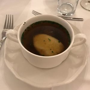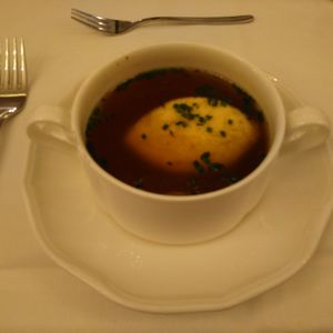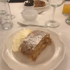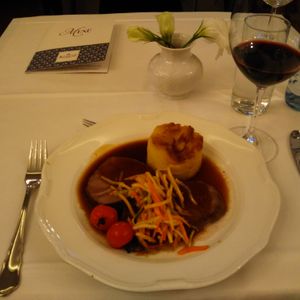 食事は、メニューが決められており選べなかったのですが、前菜が、ダンプリングのスープで、メインが厚くて硬いローストビーフのようなお肉でしたが、まずディナーですが、スープはしょっぱいし、お肉は硬くて私の口に合いませんでした。飲み物は別料金です。お料理は、お店に来た順番に給仕されるのではなく、厨房から近い席に人から給仕されていた感じで、早く来た私たちより後から来た人の方が早く食事を終えて会計されてコンサート会場に向かわれており、コンサートの席は自由席なのにレストランで待たされる時間が多く無駄でした。またコンサートの休憩時間に席を離れるのですが、自由席なのでその間に席の取り合い?があり自分たちが座っていた席を取られたB席の人が空いていたA席に勝手にうっってしまったりとかなりアバウトな感じでした。コンサートは、舞台から客席が縦に細長く、特にバレエは踊りがよく見えないのでドタバタしている音と音楽を聞いている感じでした。演奏もそんなにいいとも思えず、これで1人117ユーロはもったいないです。