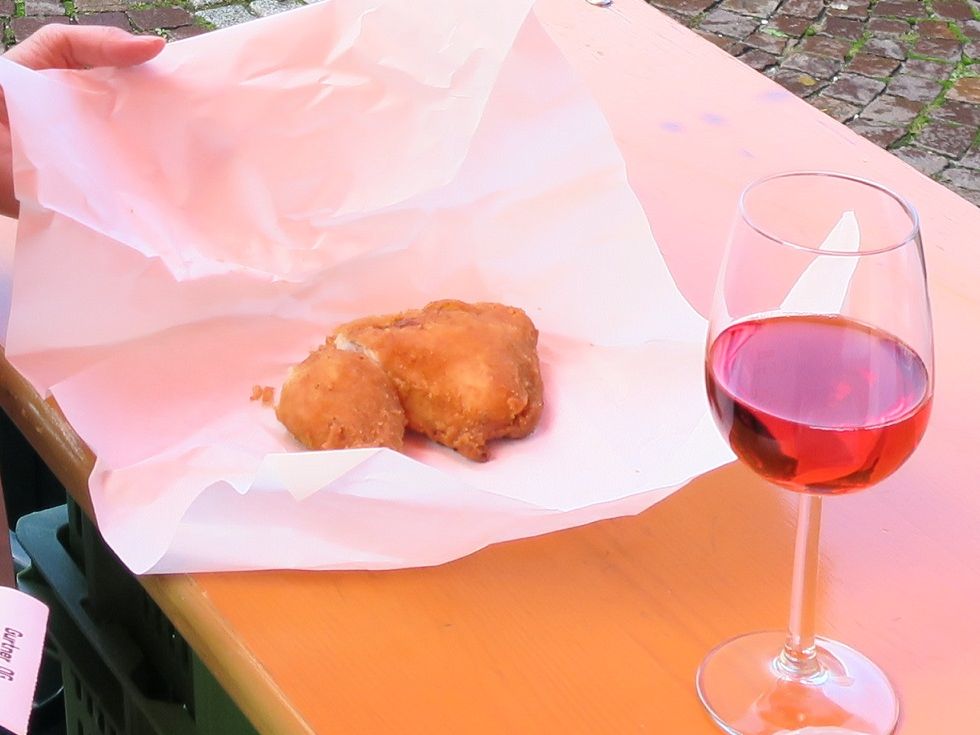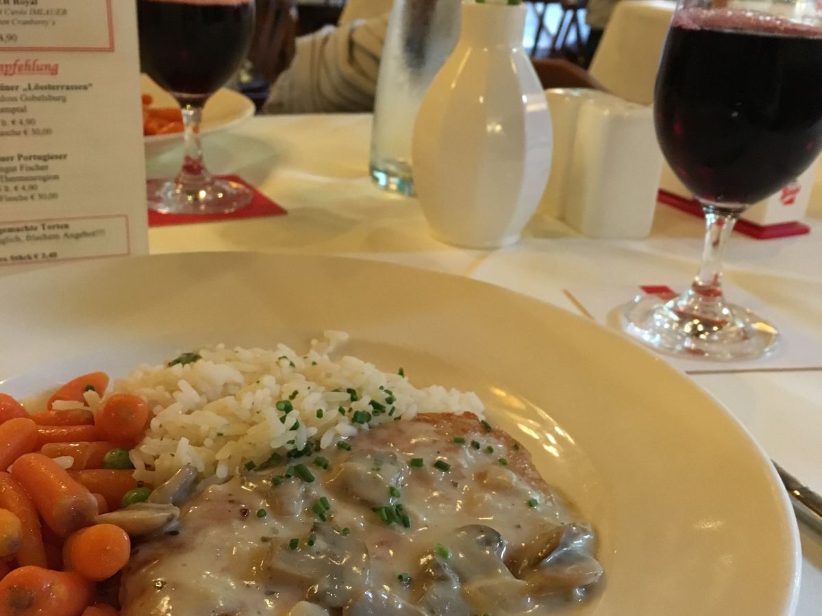 着いたらまず、サウンド・オブ・ミュージックの舞台となった宮殿のそばの広場で1時間半ほどの自由行動となり、そこで昼食をとります。木曜日には週に一度の市が立つらしく、たまたま木曜日だったので、ガイドさんに薦められたチキンを市場で購入して食べましたが、本当に美味しかったです。また、地元産のワインも飲みました。妻は、「若い女性にはスペシャルなワインを」ということで、店員のおばあちゃんからアイスワインのようなワインを特別に貰っていました。