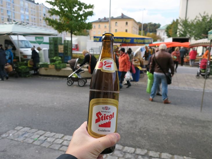 その後、再びガイドさんと合流し、5時間ほどでザルツブルクとその周辺の主要な観光地を回ります。モーツアルトの生家、サウンド・オブ・ミュージック撮影の場所、湖のクルージングなど、見どころ満載です。クルージングでは、地元の生ビールを安価(約300円)で飲むことが出来ます(写真のビールは、市場で飲んだ同じ銘柄の瓶ビールです。こちらは約120円。酒税が無いって素晴らしいです-笑)。