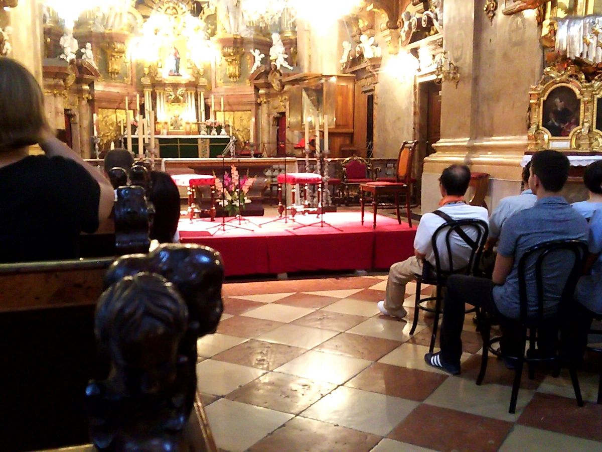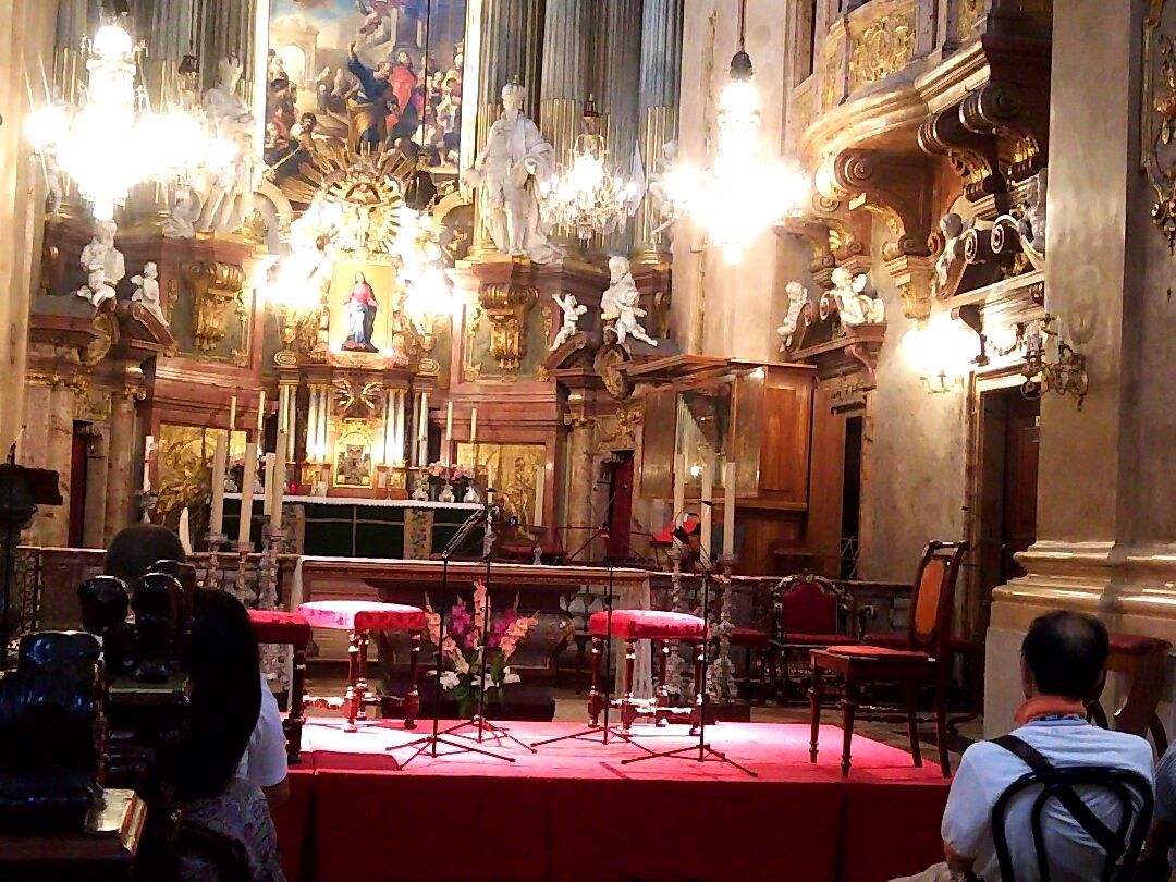 ウィーンに来たはいいが、普段縁の無いクラッシックを聞く予定などなかったのです。でもせっかくだからと思い立ち、ベルとらさんで前日にネットで予約しました。。30分前に会場につくと、cカテゴリーから1つアップグレードとのこと。(さりげなく強調されました。)カテゴリーⅡの一番前の通路側にすわらせてもらいました。開演を待っている間も教会をゆったりとながめてあきません。音楽の良し悪しは評論できませんが雰囲気がとてもよかったです。開演中の写真を撮る人(アジア系の人ではなく白人)がいて気になりました。一時間強の演奏会でした。