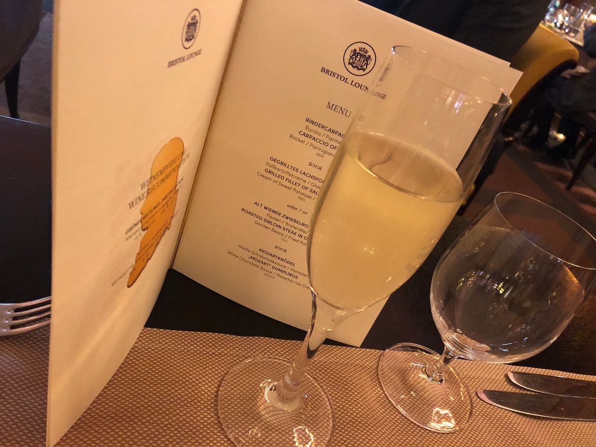 Aコース利用。ホテルBristol の中にあるレストラン Bristolでシャンパン、前菜とメインとデザートとチョコという豪華で美味しいディナーが付いていました。そこでチケットを受け取ると、荘厳な建物のフィルハーモニーコンサートが行われるという楽友会館に行き、まずCDチケットと交換でCDを受取り。その後、大きな荷物をクロークに預けるには1個1ユーロ取られましたが預けて、荷物交換券をもらいます。(今回私たちはこの交換券をもらうのを忘れてしまい、あやうく別の人が私達の荷物を受け取ろうとしていましたが間一髪で大丈夫でした。)