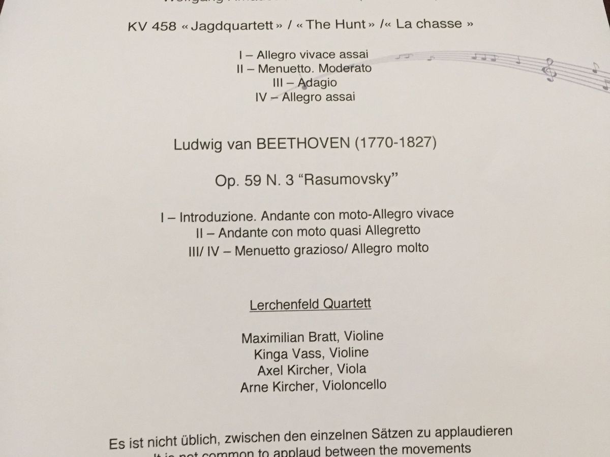 2017年8月16日、楽友教会でのモーツアルトコンサート、黄金のホールA席にて。観光客相手の適当な演奏かもしれないと危惧していましたが、プログラムの組み立てもよく、調和が感じられる演奏でした。のだめカンタービレで、音が丸い玉のようになって飛ぶシーンがありますが、黄金のホールでの音はまさにその感じです。開演前の中国人客の騒がしさには閉口しましたが、演奏中は、世界中の観光客が同じ楽曲で反応しているのを見て、音楽が結ぶ感動に胸が熱くなりました。ザルツブルグ音楽祭には行けませんでしたが、満喫しました。