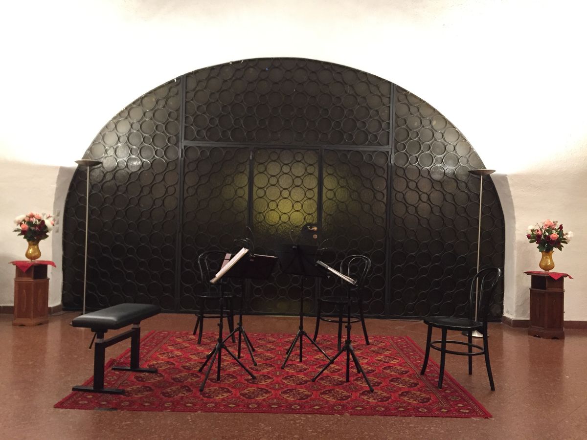 祭壇の前でなく、地下の天井が低い部屋でのコンサートです。