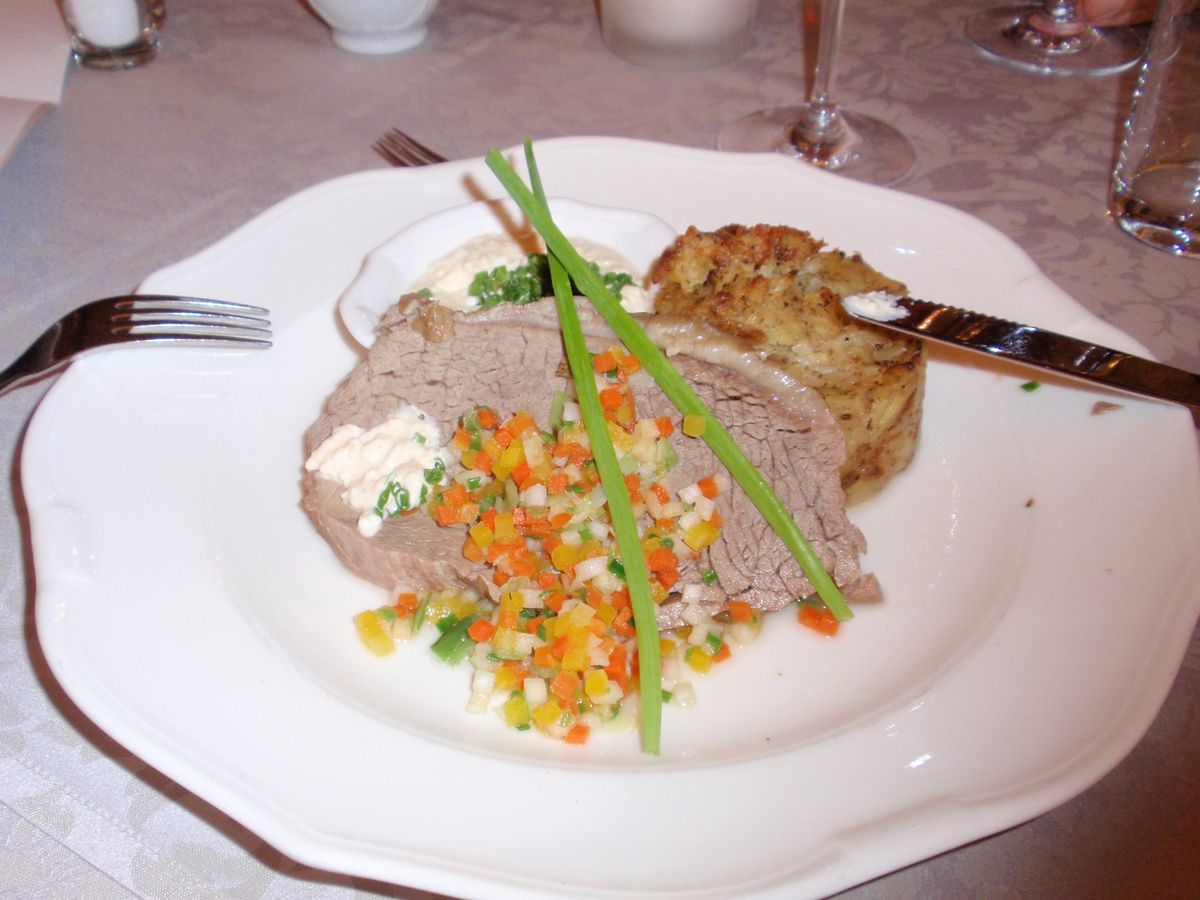 食事はオーストリアの名物料理。Tafelspitz(タッフェルスピッツ)。お味はまあまあでしょうか。個人的にはウィーン市内の、Plachuttaをお勧めします(友人の勧めでしたが肉がシチューの中につかっていていい感じ)。