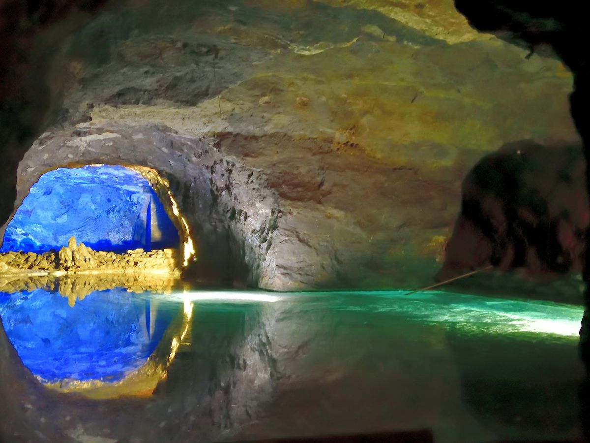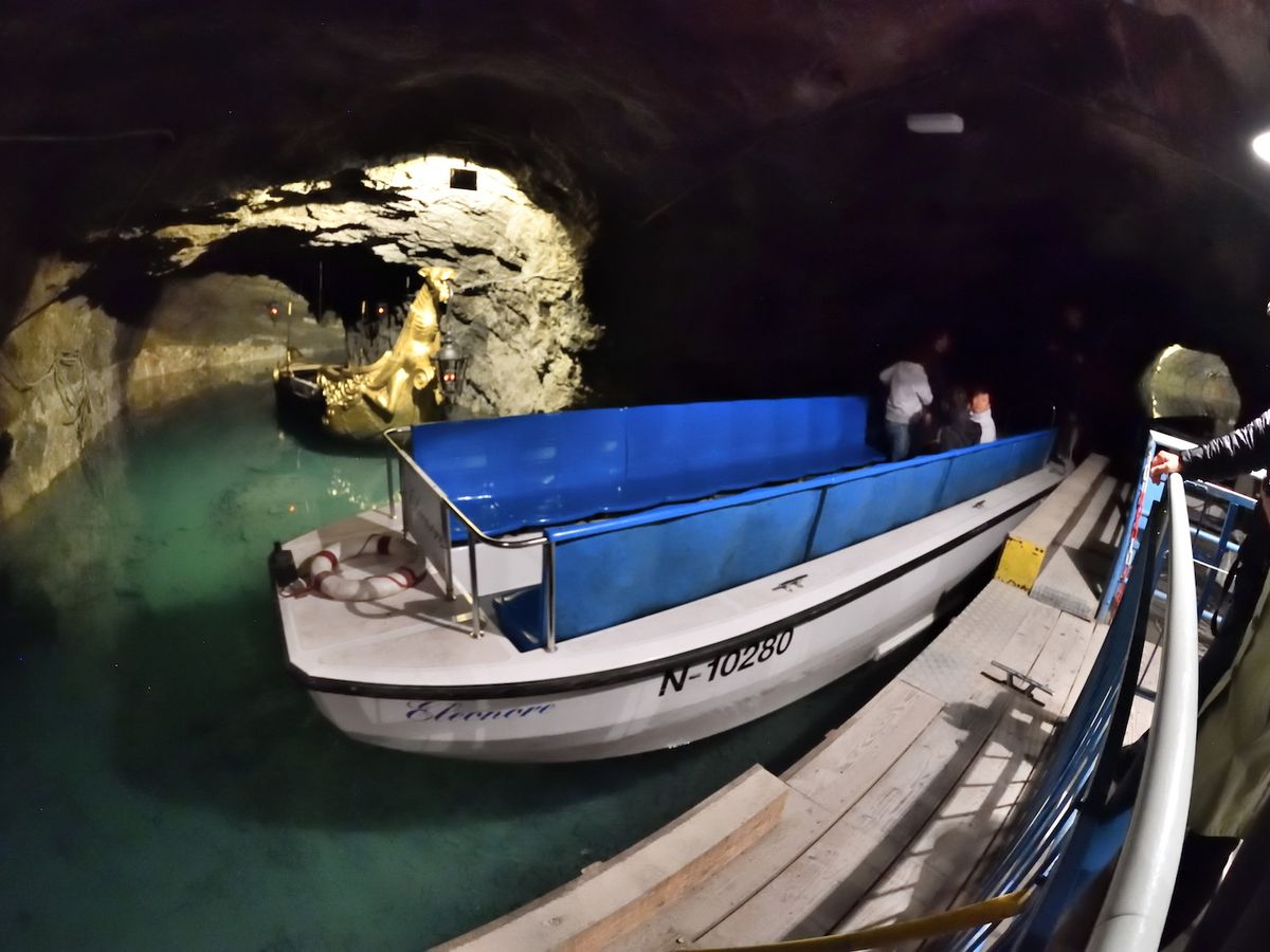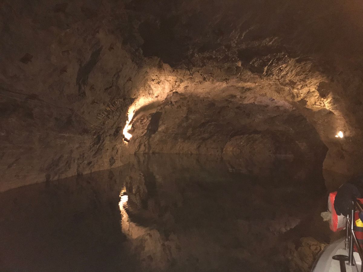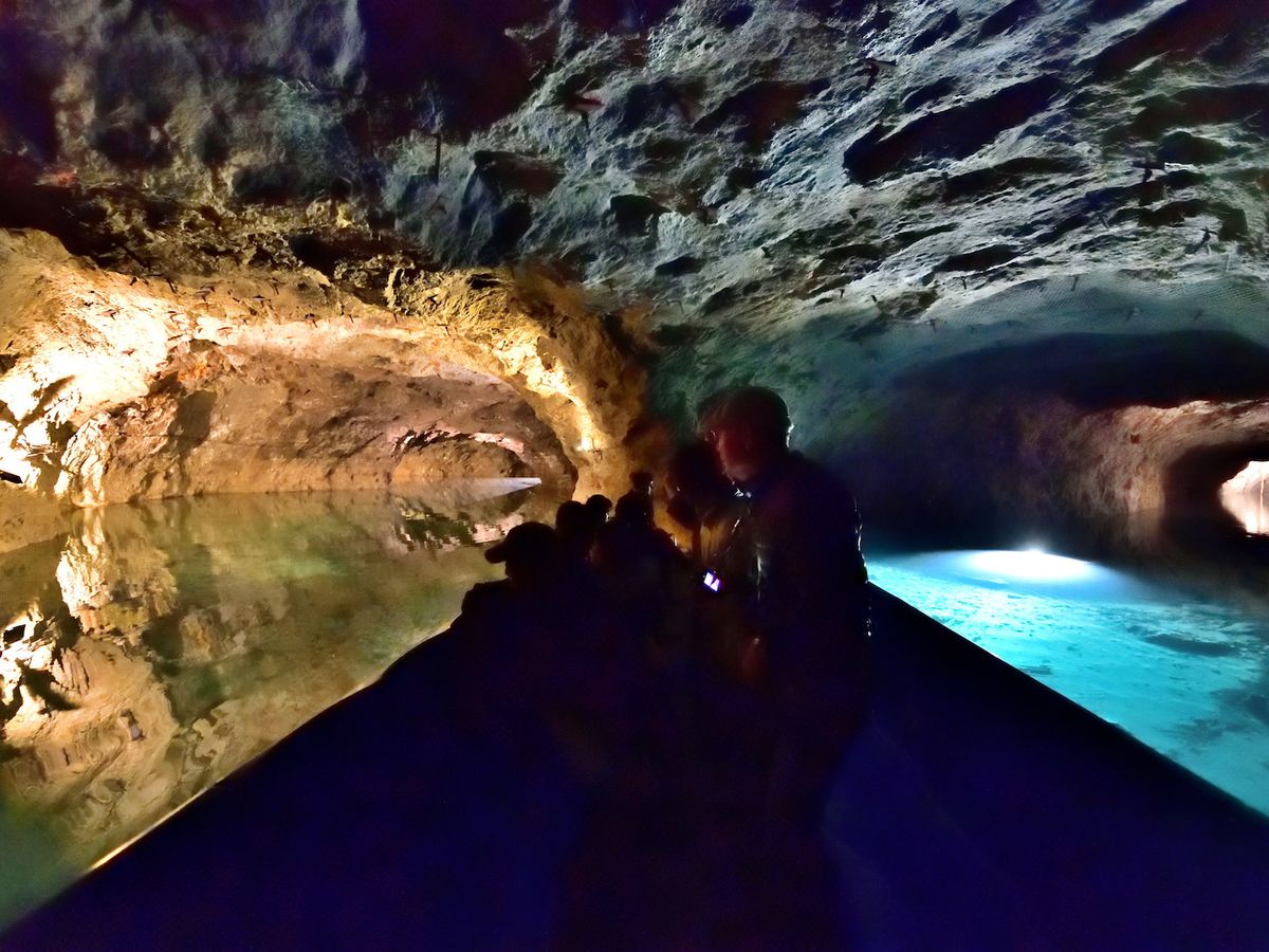 現地女性のガイドさんでしたが、分かりやすい日本語で、長い洞窟を歩いて石灰採掘やドイツ空軍のジエット機開発基地の説明を受けて地底湖へ。