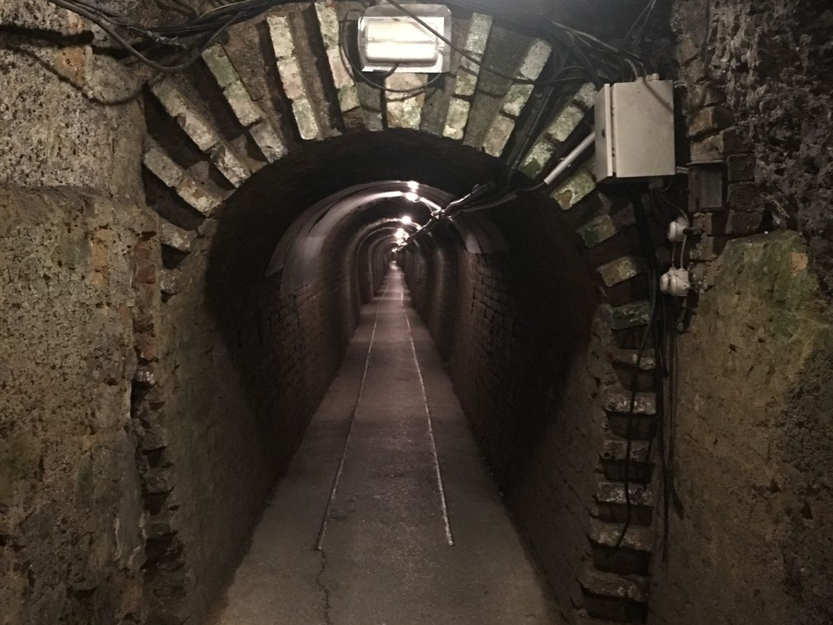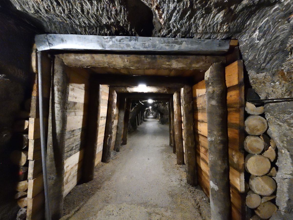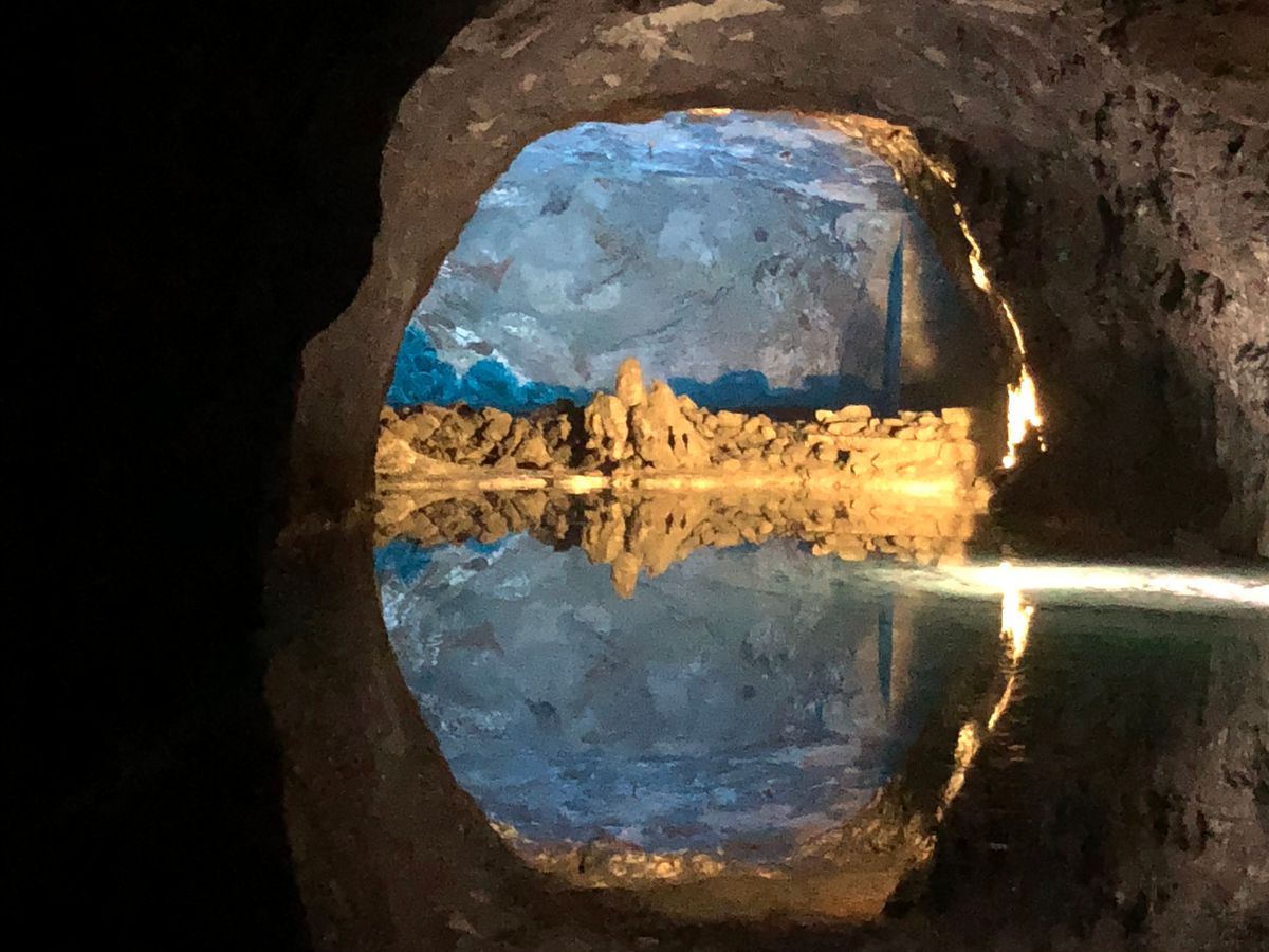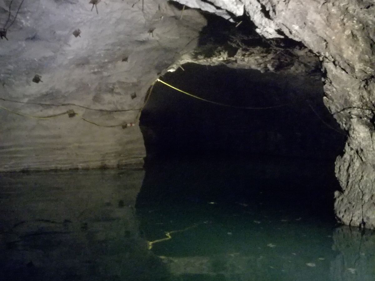 現地女性のガイドさんでしたが、分かりやすい日本語で、長い洞窟を歩いて石灰採掘やドイツ空軍のジエット機開発基地の説明を受けて地底湖へ。