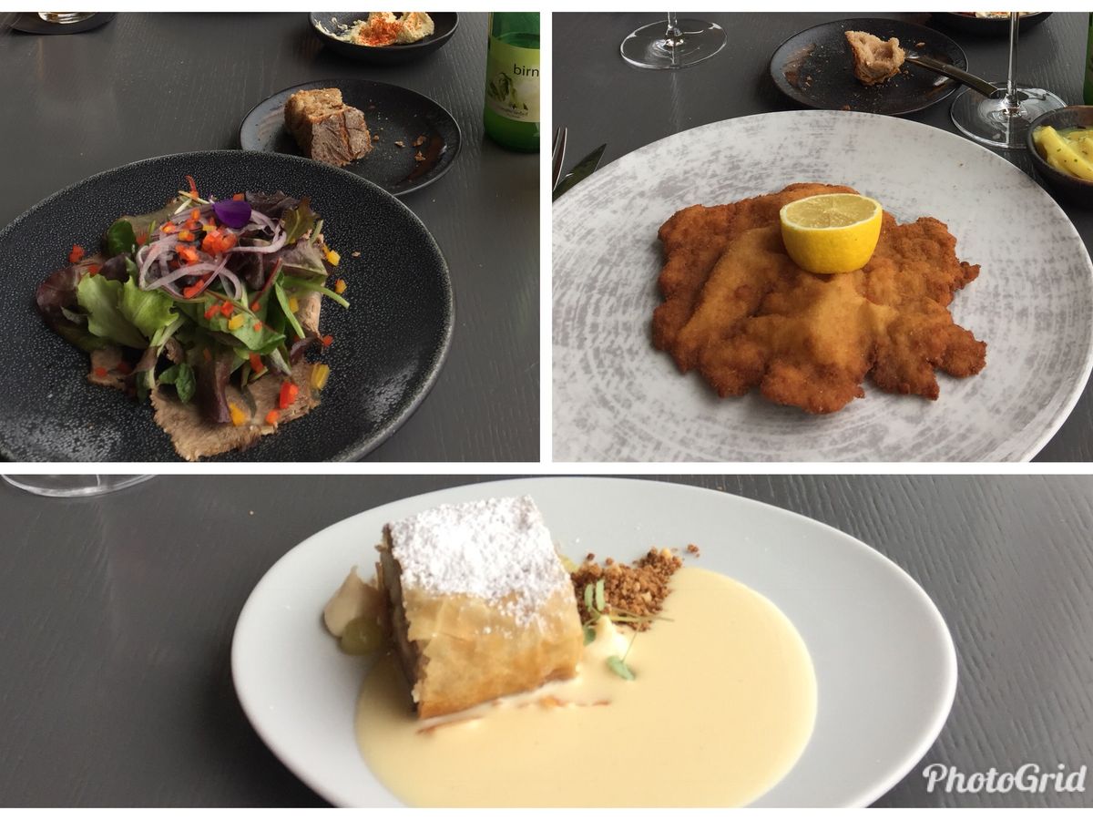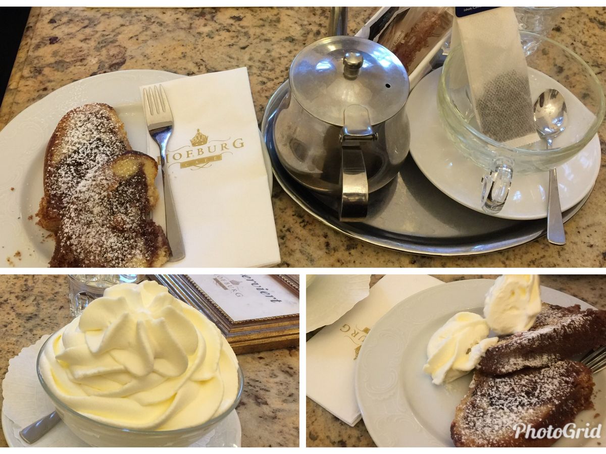 観光はガイドブックに載っているので、ランチ、カフェの写真をupします。どちらも量もちょうどよく(少し多いくらい)、パン、ローストビーフのサラダ、シュニッツェル、デザート、どれも満足でした。カフェでは、甘くない生クリームたっぷりで美味しかったです。