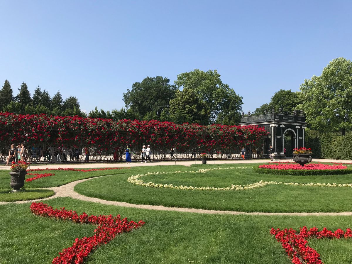 アルベルティーナ美術館エスカレーター前に5分くらい前に集合すると既に皆さんお集まりで、総勢12名のツアーで、ひとり参加は私だけでした。シェーンブルン宮殿からスタートし、宮殿内部を巡っている間はあまりイヤフォンの調子が良くありませんでしたがオーストリア人ガイドのモニカさんが熱心に説明してくださいました。庭園は薔薇が咲き誇っていて、素晴らしく、時間があれば丘まで行ってみたかったです。
