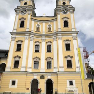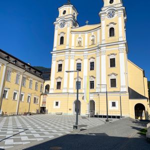 ハルシュタット湖は高い山々に囲まれた深緑色の湖で、教会広場を中心に湖岸の斜面に折り重なるように木造の民家がたっています。遊覧船の渡場があり、人懐こい白鳥が餌を求めてやってきます。Seehotel Gruner Baumというレストランで、ベジタリアンフードを食べました。キノコソースの皿の真ん中にとうもろこしの団子がどーんと乗っている妙チキリンな郷土料理で、いささか繊細さに欠けますが、湖岸のテラス席から絶景を鑑賞しながら贅沢な気分でした。ハルシュタットは先史時代に世界最古の豊富な塩坑が見つかって以来、栄えた街だそうで、レストランのテーブルにも赤みを帯びた塩の壺が置いてありました。土産物店には宝石のような岩塩の塊が売っており、一つ買いました。3€。添乗員の青年はザルツブルクへの帰途、モントゼーという街へ立ち寄ってくれました。あとからガイドブックを読んで知ったのですが、ここはザルツカンマーグートのモント湖のほとりにあり、またまたsound of musicゆかりの地で、マリア・テレシアイエロー?の聖ミヒャエル教会を中心にカラフルなファサードのカフェや土産物店が並びます。