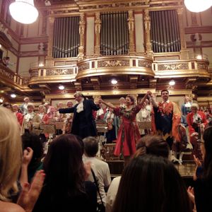 ディナーは、品数は少なかったですがおいしかったです。パンケーキを細く切ったものをスープに浮かべてあったり、お肉はボイルであっさりとで、なかなかほかのレストランではいただけないものでした。デザートはアップルパイでしたが、そんなにあまくもなく口にあいました。コンサートは、前半モーツアルト休憩を挟んで、後半ヨハンシュトラウスの曲でした。オペラやバレエなど飽きさせません。お客さんのマナーもよくて、最後はみんなで手拍子で、盛り上がりました。ドレスを着て参加されている方もいらっしゃいましたが、カジュアルな格好で全然大丈夫でしたよ。