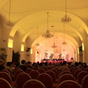 C席で参加しました!現地はウィーンの中心部から少し離れていて、U-Bahnで15分(片道約2ユーロ)ほどだったと思います。シェーンブルン宮殿の駅に着いたら、宮殿入口より駅に近い場所にオランジェリーがあり、宮殿内を見学したいのであればそちらを先に行くことになると思います(そうでないとコンサート後は閉まってしまいますので)。コンサートは実際のオペラなどを見る階段式のホールとは違った、一つの大きい部屋を借りてやっているという形でした。席の違いは前であるか後ろであるかの違いのみでした。写真はディナーを頂いたレストラン内の写真です。