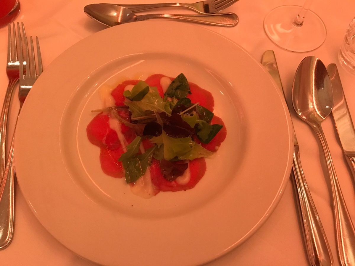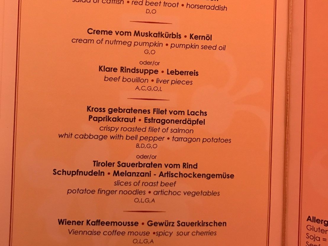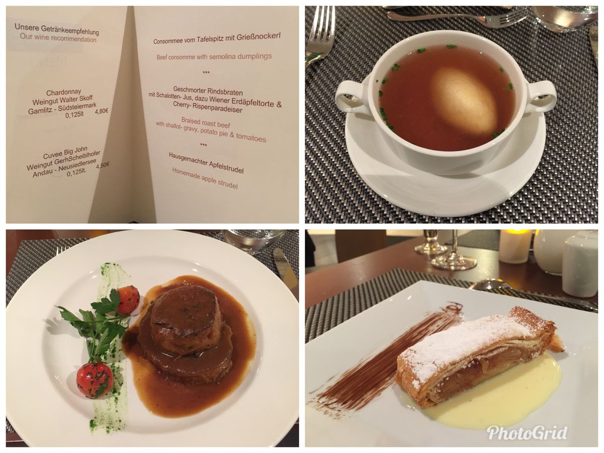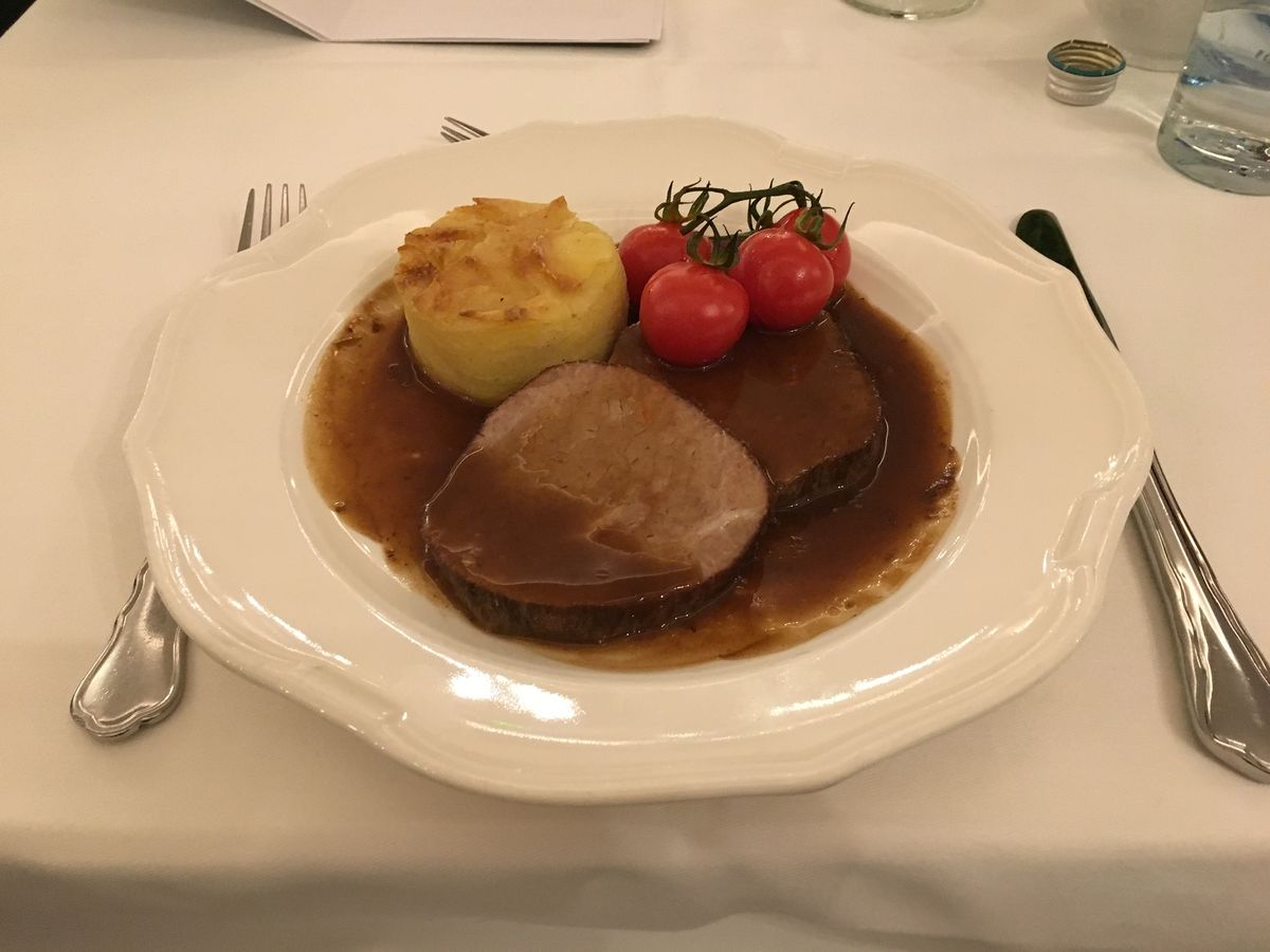 ブリストルでの食事は他のみなさんも口コミに書いてあるように、デザートがいまいちだったがそれ以外は美味しかった。メイン料理は牛肉かサーモンか、で選ぶことができた。トイレはレストラン入り口横と楽友協会にもあった。