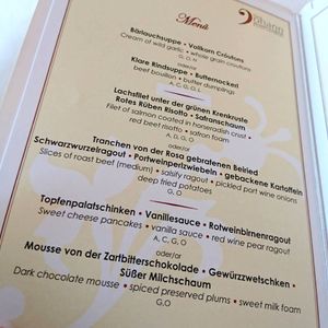 レストランはシェーンブルン宮殿の門を入って左側の建物の地下です。門は閉まっていましたが、門のところにたまたまいたスタッフの方にバウチャーを見せたら開けてくださいました。料理は3品、スープ、メイン、デザートです。かなりお腹いっぱいになります。(デザートはパスしました)ドイツ語メニューしかなく、値段も書いていなかったので進められるまま頼んでいたら飲み物代がかなりかかってしまいました。(クレジットカードは使えます)サービスに時間がかかるので、コンサートの時間を見ながらレストランを後にし、先ほどの受付のあった建物に戻ると上着を預けるように言われます。(2ユーロ)そのあと会場に入り、前から10列目くらいからがA席で、自由席でした。B列以降だとちょっと遠いかなと思います。途中で一旦休憩があるので、付いているバウチャーで飲み物がもらえます。ただ混んでいるので早めにオーダーした方が良いかと思います。コンサートが終わったら約束していた場所にドライバーさんが迎えに来てくださり、車でホテルまで送ってくださいました。市街地から少し離れているし、タクシー以外の交通手段も遠く、タクシーも混んでいるので送迎付で大正解でした。