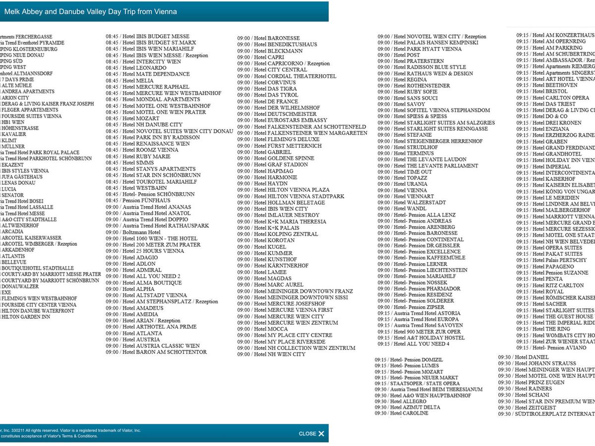ドナウ川クルーズのために申し込みました。メルク修道院では,ガイドさんが丁寧な説明をしてくれました。その後,ドナウ川をのんびりとクルーズしました。当日はあいにくの雨でしたが,クルーズしながら眺めるヴァッハウ渓谷はとても良かったです。
