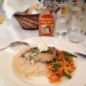 ・バスが遅れたこともあり、船の上で食事を済ませた。それなりに美味しいウィーン的な料理とワインが楽しめる。我々は、前述のように船尾での食事となってしまったが、これで上甲板の席が空いていれば、船旅はさらにすばらしかっただろう。(メルクに着いたら、遅れをとりもどすために、食事時間が削られるかと思ったが、そのようなことはなし)。