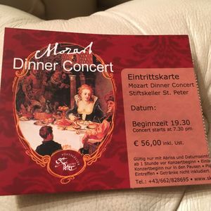 一番高い席がよいとのことで気張ってそれにしましたが、とにかく量が多く、メインの肉の時点でおなかがいっぱいになってしまいました。残すのはとても気が引けましたが、気持ちが悪くなるくらい、諦めました。最後のデザートもザルツブルク名産のものでしたが、焼き上げるまで20分かかるとか、他のお客は食べ終わって帰り支度のかな、私達はひたすら待ち、出てきても一口食べるのが精一杯。事前にメニューが女性には多く、また他より時間がかかることを言ってほしかった。席は一番前で素晴らしかったのですが、料理を考えると、二番目のブランクでいいと思います。コンサートはオペラの歌がメインでしたのでもっと勉強していけばよかったとしきりに反省でした。
