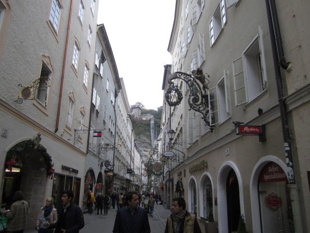 さてツアーですが、行きが5時間、現地が4時間、帰りが4時間の旅は60歳近い我々にはちょっとハードではないかと思っていました。しかし行きは途中で日本には無いような素敵なレストランに寄り朝ご飯、山や湖の地方に入ってからは高速を降りてきれいな景色を車内からゆっくり見ながらの旅。現地に着いてからは、日本語ガイドさんの案内が美しいミラベル庭園から始まって1時間くらいざっとあり(写真を撮ってくれたのですが後で見るとサウンドオブミュージックに出てくる名シーンの背景でしたので感激しました)、有名な岩塩(ザルツは塩という意味)のお土産ものやさんに連れてってもらって美味しい塩(日本では新宿の伊勢丹でしか買えません、しかも数倍の値段)をゲットしたあとは自分で観光。時間が短いのですがホーエンザルツブルグ砦にロープーウェイで登り、すばらしい世界遺産の町並みを激写。降りてから再び街の中を歩き、孫へのクリスマス用のお土産を購入した後、ザッハホテルのグリルで遅い昼食を取りました。さすが一流ホテルのレストラン、ウィーンにもありますがザルツのは人が少なくとても感じが良くてカツレツも美味しかった。ちょっと田舎のホスピタリティー?