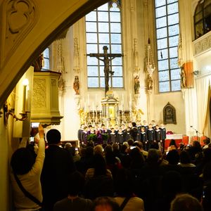 2019年4月21日、イースター当日でした。ウィーン歌劇場のオーケストラと合唱団(男声)とウィーン少年合唱団による「モーツァルトのミサ曲」、司祭の説法、礼拝堂聖歌隊によるグレゴリオ聖歌が交互に続き、「ヘンデルのメサイアからのアレルヤコーラス」が終曲に。コンサートで曲だけ聴いていたらわからなかったミサ曲の使われ方が体感できました。モーツァルトの時代のミサを疑似体験できます。観光客が多いと聞いていましたが、地元やドイツ語圏の方、キリスト教信者の方が大半で、儀式一式がまるでエンターテイメントのように感じました。私も妻も信者ではありませんが、黒を基調に、セミフォーマルの服装で行きました。カジュアルな服装の外国人もいましたが、宗教儀式だと強く認識して参加されていました。機会があれば是非参加すべきだと思います。コンサートではないので、アンコールもなく、司祭や聖歌隊以外の音楽家の顔は全く見えませんが(私達の席は2階中央左側の最前列でした)ミサ終了後、礼拝堂の外で、ウィーン少年合唱団のメンバーと個人的に写真が撮れる機会が(礼拝堂の配慮で?)ありました。