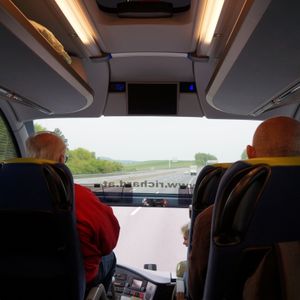 夜明け前6:35、集合場所にバスが2台到着しましたが、係員は不在。私たちは、ザルツブルクの表示がある2階建てバスに乗り込みました。運転手に「ザルツブルク?」と尋ねたところ運転手はうなずきましたが、それでも、この車両が本当にツアーバスなのか、ただザルツブルクへの長距離バスなのか分からず不安でした。6:50、車内アナウンスもなく発車し、不安は増すばかり。そのとき乗り込んだ添乗員が私たちのバウチャーを確認しにくるまでは、間違えて乗車していたらどうしようかとドキドキしていました。