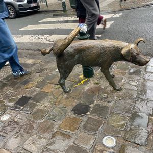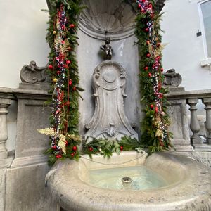 目印は白ツアー名を書いた服を着ているとあったので白い服を探しましたが見当たらず、心配しましたが、黒色のダウンコートを着てました。英語で説明しながら歩きまわりチョコレートの試食2店舗、小便小僧、小便少女他を見ながら食事場所へ到着。ビーフシチューかムール貝選択、デザートはチョコレートムースこワッフルでした。小雨が降って寒く解散。路地に入って行かないと見れないものも見れて良かった