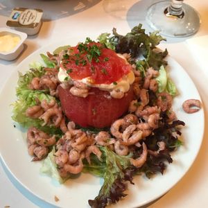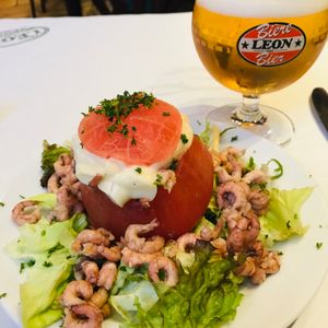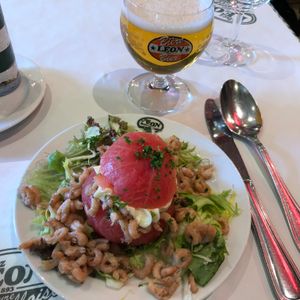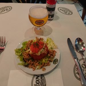 観光客に人気なのか?地元の人にも人気なのか?分かりませんが、10人は絶えず列を作り並んでます。バウチャーを持って約10分前に行ったら、直ぐに2人用の席に案内され、先ずはハーフサイズのビール、前菜・小さなエビとトマトです冷えていて!グッド バケットも出てきました。メインのムール貝のワイン蒸し!見た目はボリューム満点です女性でも食べられます。ビール好きなんで、追加でビールをウェター任せで2杯、メインも追加してしまい、追加料金約60€。バウチャーの価格が日本円で5.500円?だったでしょうが!兎に角!ヨーロッパの食事の価格は日本の1.5倍します。ヨーロッパでは日本人の舌に合わない料理もありますが、ここのレストランは日本人の舌に絶対合います。ブリュッセル滞在予定なら!日本でバウチャー購入をお勧めします!並んでる旅行者を斜めに見ながらビジネスクラスの様に入店で〜す☺️
