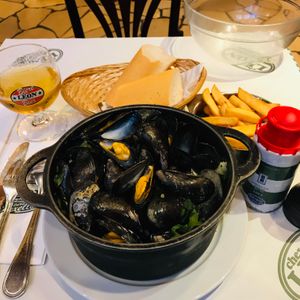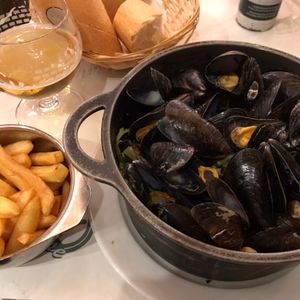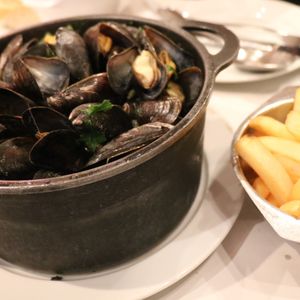 有名なお店ということだったので、忙しい時間にひとりで行くのはゆっくり食べてられないかなーと思い、15:30で予約しました。実際は並んではいないものの、結構席が埋まってましたが、すんなり中の席に通されました。そんなに待つことなく料理が出され、スムーズに食事ができました!普段よく食べる方ですが、さすがにフリッツは残してしまいました。バゲットなんかは手付かずです。とにかくムール貝をおなかに詰め込みました。おいしかったですよ!