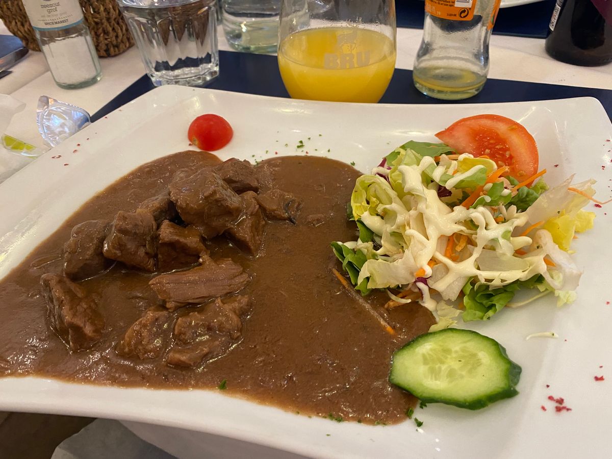 目印は白ツアー名を書いた服を着ているとあったので白い服を探しましたが見当たらず、心配しましたが、黒色のダウンコートを着てました。英語で説明しながら歩きまわりチョコレートの試食2店舗、小便小僧、小便少女他を見ながら食事場所へ到着。ビーフシチューかムール貝選択、デザートはチョコレートムースこワッフルでした。小雨が降って寒く解散。路地に入って行かないと見れないものも見れて良かった