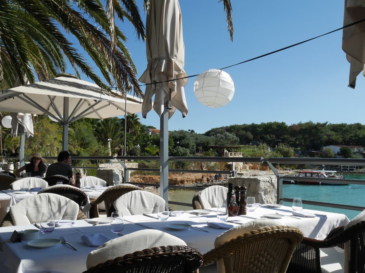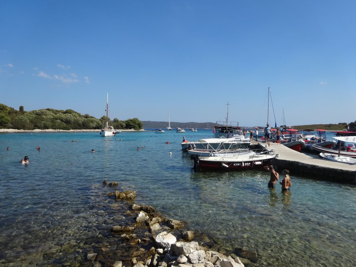 次に30分ほど走ってパクレニ諸島に向かいましたが、途中イルカが跳ねる姿を何回か目撃しました。やがてパクレニ諸島のパルミジャーナ湾に到着し、ここで昼食及び海水浴のため2時間フリータイムとなりました。昼食は2件しかない(?)うちのツアー会社お薦めのレストランでほとんどの人が取りました(別料金)が、ここの食事(シーフードのリゾットとパスタ)はあまりおいしくなかったです。ここでも若いカップル2組は泳いでいました。
