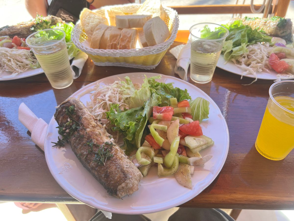 船上のキッチンで調理された魚のランチが本当に美味しくて、たっぷりのサラダとオリーブオイルとワインが格別で最高でした!