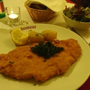 食事はコースになっており、コンソメスープ、シュニッツェル+サラダ、ザッハートルテにサービスのパンとパテが最初に出されます。とにかく量が多いです。シュニッツェルは日本のカツの二枚分はありました。
