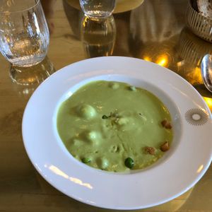 食事はグリンピースのスープの後のメインに同じグリンピースのソースを使うのは、あまり味に変化がなかったので少しがっかり。