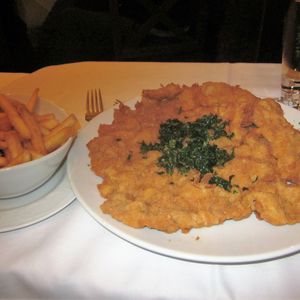 シュニッチェルは、熱々が出てきて、お肉も柔らかで、レモンだけで食べるのですが、適 度な味がついていて、これもとても美味しかったです。でも予想以上に大きく、頑張った のですが、3分の2食べるのが精一杯でした。フライドポテトも別の器に、山盛りです。 ただ、その時気がつかなかったのですが、予約のメニューにサラダとあったのですが、サ ラダが出てきませんでした。どんなサラダが出る予定だったのかわかりませんが、それ が残念です。あっさりしたものが口直しに食べたかったです。