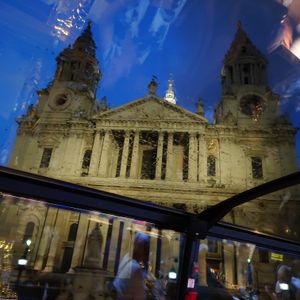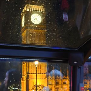 ロンドン到着の初日にディナーも兼ねてロンドン市内をバスで観光できるという事で申し込みました。コヴェント・ガーデンのホテルに宿泊していたので、集合・解散も徒歩で行けてとても便利でした。2階建てバスの2階部分がレストランのようになっていて、グラスに注いだ飲み物が車体の揺れでこぼれない様に固定できる器具がテーブルについています。バスが動き始めて、最初にロンドン塔、タワーブリッジが見えた時はテンションが上がりました。タワーブリッジをバスで通過して進んでいき、市内の名所を廻ります。この日は残念ながら雨模様で、名所を綺麗に撮影出来なかったのは残念でした。バスの屋根は透明で景色は見やすいですが、雨で濡れると綺麗に見えない所もあります。