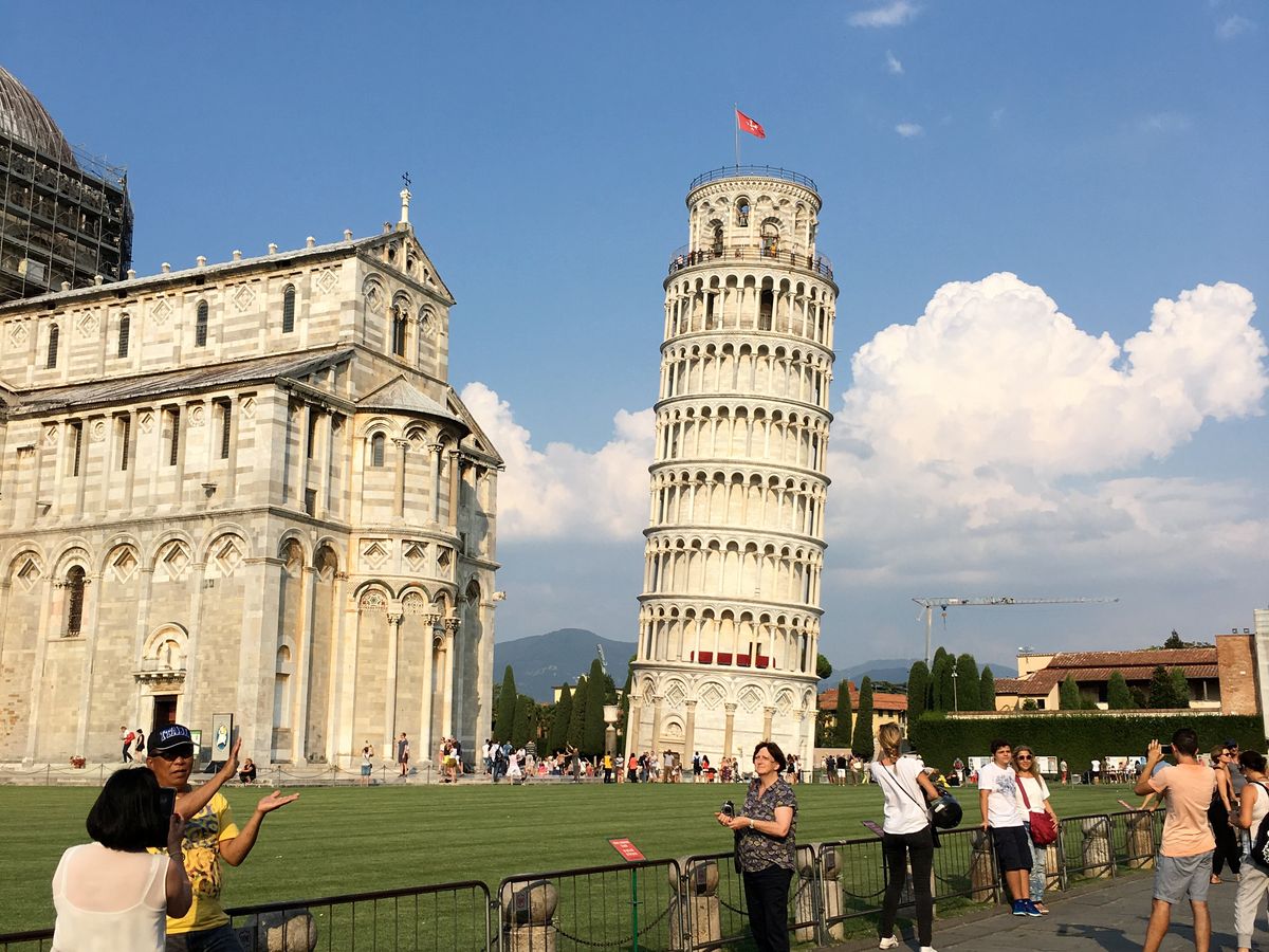ピサは個人で電車でもいけますが、乗り換えや時間を考えると、何も考えずバスで移動できるのはとても楽だと思いました。また、駐車場から斜塔広場まで、歩くと15分程度ですが、多数決をとって一人1-2ユーロで乗合いトラムで駐車場から移動しました。暑い日やツアー参加者の年齢の幅があるとき(特に高齢の方がいるとき)にはこれが正解だと思います。