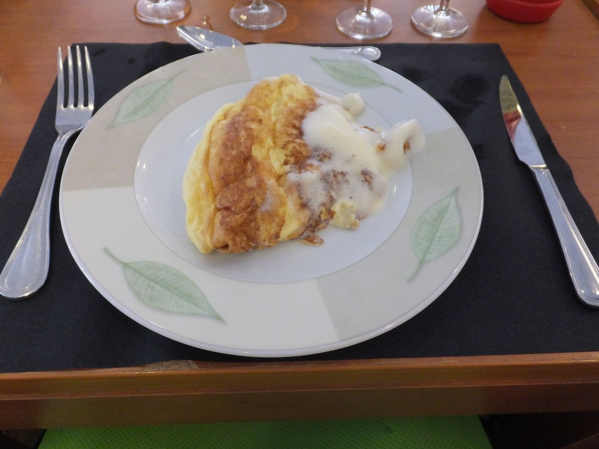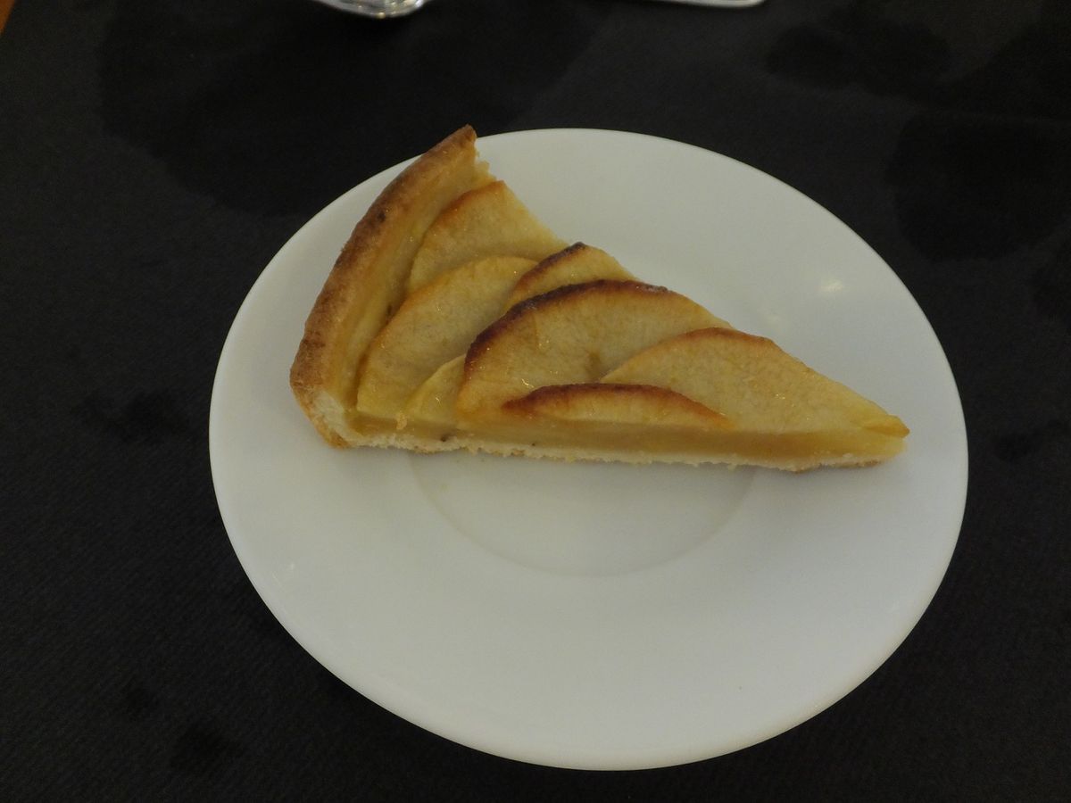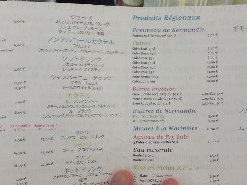 モン・サン・ミッシェルに着くと、まずは対岸で食事(オムレツ)を食べます。味は好き嫌いの分かれるところかもしれません。アップル・パイもつきます。飲み物は追加料金でのオーダーとなりますが、350mlの生ビールで4ユーロでした。ただし、料金を集めに来る店員は計算が苦手そうで(?)、お釣りを間違えられるかもしれません。