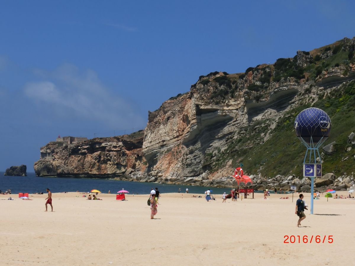 ナザレは、きでいな砂浜沿いにレストランが多数あり、6月で既に海水浴をしていました。