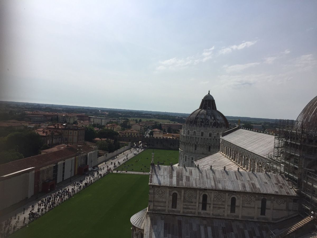 斜塔に入場すると、直ぐに傾いている事に気が付き、何故か驚く!!螺旋状にある大理石の階段をグルグルと200段程登っていきますが、途中で疲れるため、階段傍で休暇しがならでも可です。塔が傾いているため、階段の昇り降りが楽な箇所と辛い箇所があります。登るとピサの町並みが一望できます。そして、登る価値あり!!と感じます。そして各自記念撮影。斜塔内に入場してから出るまで、30分間程?の時間制限がありますが、私達は結局10分程時間を余らせて退場しました。