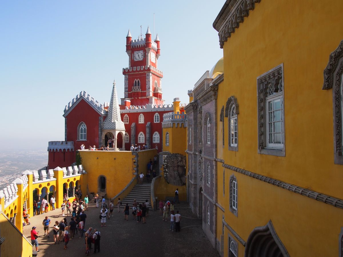 ペーナ宮殿はカラフルすぎで、まるでアラビアンナイトに出てくるみたいなキュートさ。ちょっとしたテーマパークのよう。楽しめます。宮殿の麓には土産屋がひしめいていて、あちらもこちらもみたくなります。